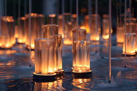 A large fountain with a gold colored water spout. The water is reflecting the light from the surrounding area, creating a beautiful and serene atmosphere