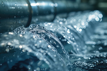 Detailed close-up of water flowing in a modern water treatment plant, showcasing the purity and movement of water with a blue color palette.