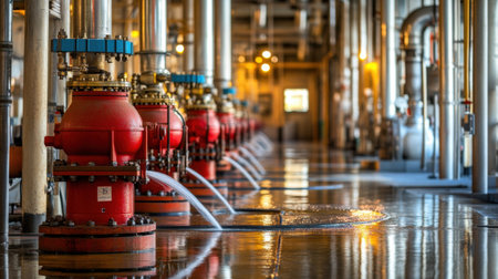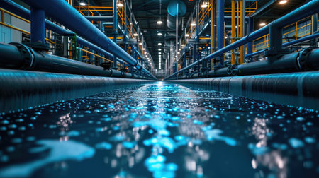 This image captures a modern industrial water processing facility, showcasing pumps and hoses on a shiny floor, emphasizing technology and engineering in fluid management.