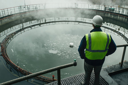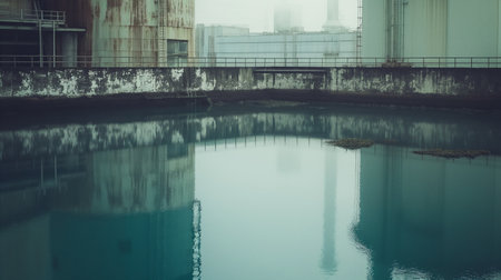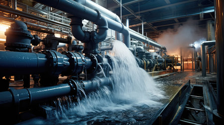 A wastewater treatment facility with pumps and filtration systems, demonstrating the machinery that cleans water. Generative AI