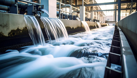 Captivating image of flowing water in an industrial setting, showcasing the vigorous motion and splashes that emphasize the dynamic energy of the purification process.