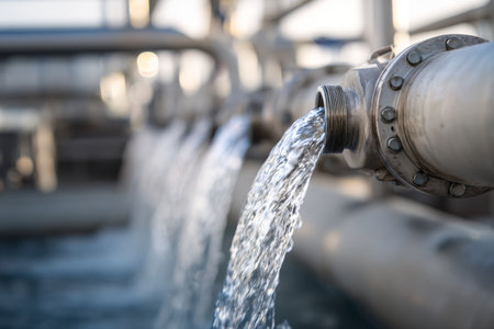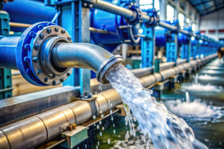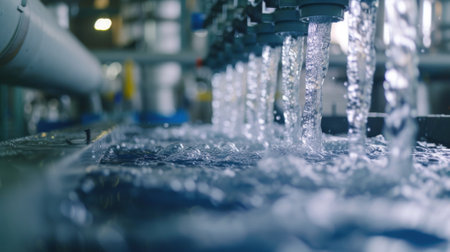 Crystal-clear water flows gracefully through a pipe in a water treatment plant, a vital process for ensuring clean and safe water supply.