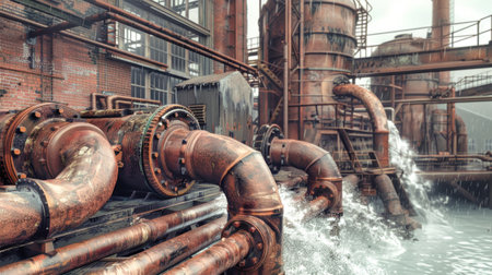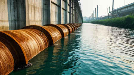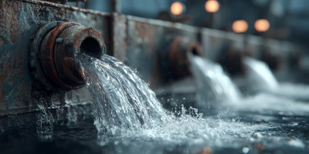 Close-up of factory pipes releasing contaminated water, symbolizing environmental degradation
