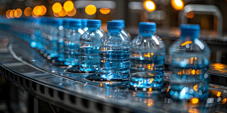 Modern water bottling plant in operation with automated machinery ensuring production of fresh pure water. Concept Bottling Machinery, Water Quality Control, Automated Plant Operations