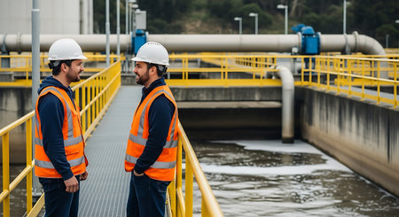 Two workers wearing hard hats and orange safety vests stand on a platform at an industrial water treatment plant. Yellow railings surround the platform. Large pipes and concrete structures are visible.
