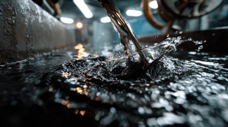 A captivating close-up image capturing the dynamic motion of water splashing in an industrial environment, highlighting surfaces and reflections.