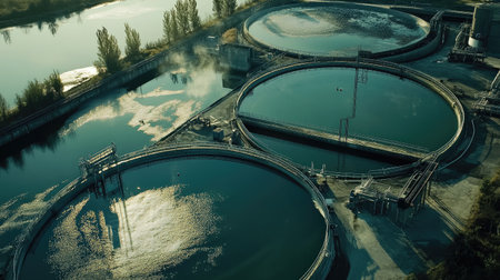 Circular clarifier tanks at a wastewater treatment facility, showing water purification efforts for clean rivers