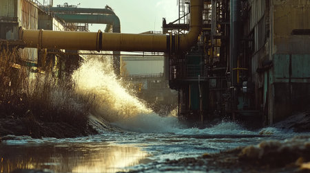 Wastewater pouring from large pipes near a factory, symbolizing the environmental impact of industrial waste