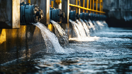 Flowing reclaimed water cascading over industrial sluice gates. Generative AI