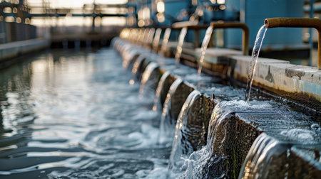 Crystal clear water cascades through aeration basins in a state-of-the-art water treatment facility. This powerful flow represents the critical process of purification, turning wastewater into a safe, clean resource for the community, highlighting modern environmental engineering and public health infrastructure.