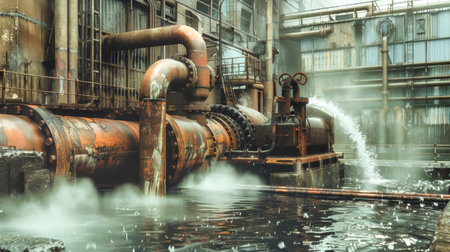 Clear water streams energetically from a metal pipe within a manufacturing facility. The setting is illuminated with soft lighting, highlighting the splashes and movement of the water.