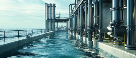 Industrial water treatment plant in the sea. 3d rendering.