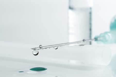 Closeup of pipette with serum, hyaluronic acid on blue background. Cosmetics and healthcare concept. Dose of essential oill, retinol with air bubbles. Beauty product presentation, front view, macro