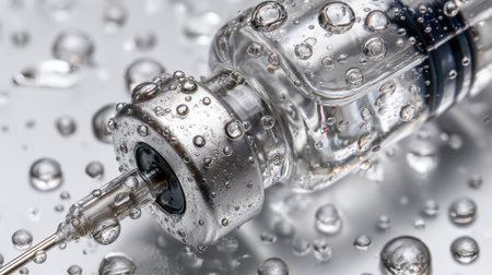 A close-up of a clear syringe encircled by tiny water droplets, emphasizing clarity and meticulous engineering in advanced fluid delivery devices.