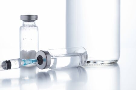 Medicine, Injection, vaccine and disposable syringe, drug concept. Sterile vial medical syringe needle. Glass medical ampoule vial for injection.
