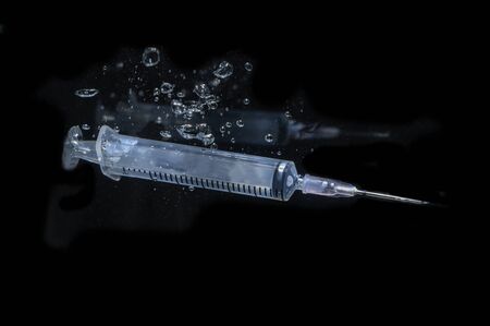 Close-up of vaccine drop on syringe needle. Water drop falling from the syringe needle