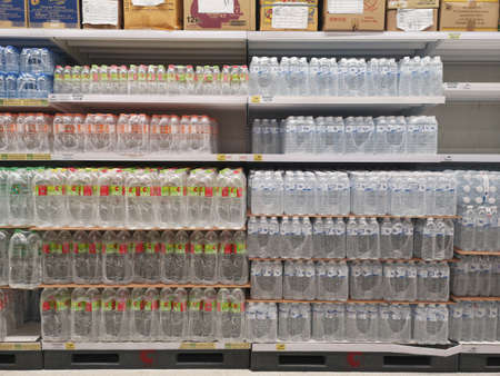 Bangkok Thailand - 29 April 2022: Many brands of mineral water on the shelf in Foodland supermarket Sukumwit16 branch