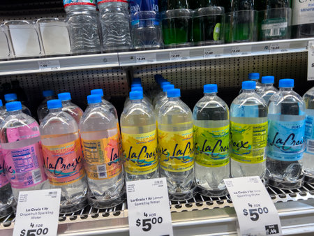Mill Creek, WA USA - circa October 2022: Angled view of refridgerated bottles of La Croix for sale inside a Town and Country Market.