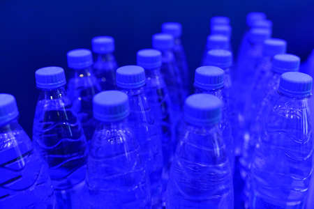 Many blue plastic bottles with blue caps with mineral water in a supermarket. Close Up. Main subject of a focus
