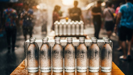 A captivating image showing clear water being poured from a glass bottle, creating vibrant splashes and droplets against a dark backdrop, symbolizing freshness and hydration.