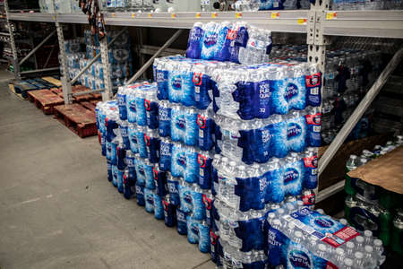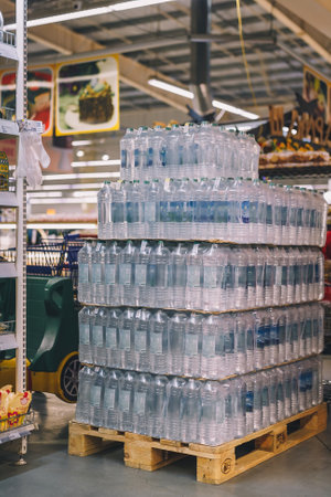 Minsk/ Belarus - March 20 2020: Pallet of bottled water in the store. Quarantine-2020 concept