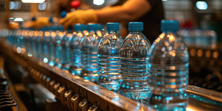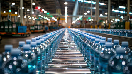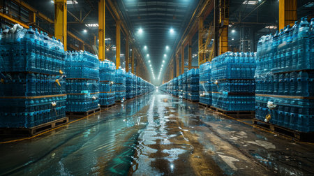 This image captures a scene inside a modern factory where bottled water is being produced. Clear plastic bottles are neatly arranged on wooden pallets, showcasing the production process. The spacious industrial environment suggests efficiency and organization, essential for beverage manufacturing.