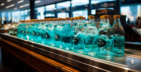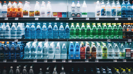 A vibrant scene of colorful bottles of various drinks neatly lined up on supermarket shelves, with soft focus and dynamic lighting creating a lively and modern retail atmosphere. Ideal for themes related to beverages, shopping, and consumerism.