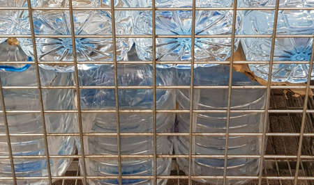 Rows of clear water bottles fill shelves in a well-lit storage area, reflecting light and creating shadows.