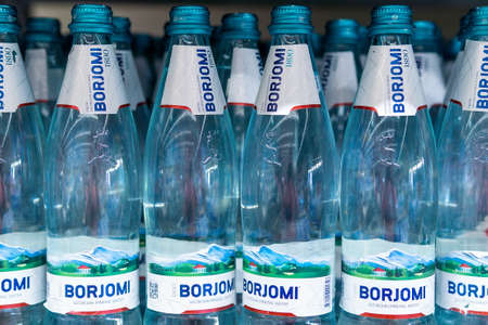 Tyumen, Russia-June 05, 2020: Borjomi is mineral water in glass bottles a close up of a bottle at the hypermarket