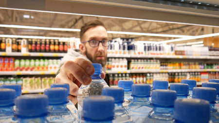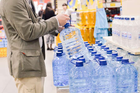Close-up of many plastic bottles of water on a supermarket shelf and a male buyer takes one