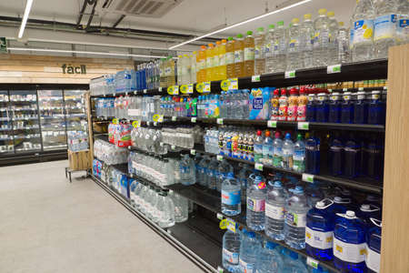 Mineral sparkling and pure water on the supermarket counter. Assortment of different brands.
