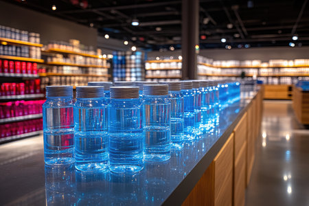 Row of Blue Liquid-Filled Bottles on a Countertop in a Store