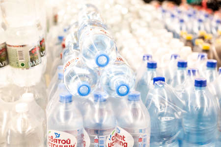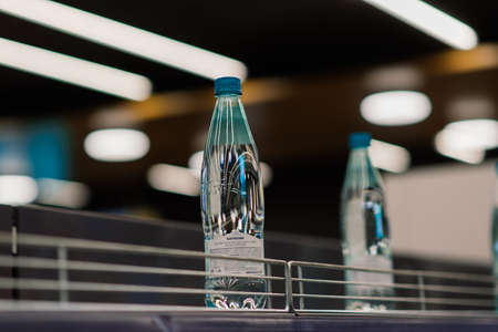 Minsk, Belarus - 03.29.2021. Few drinking mineral water bottles on shelf left in department store, lack of a goods