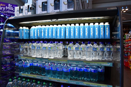 KUALA LUMPUR, MALAYSIA - SEPTEMBER 15, 2019 : Variety of Mineral Water on the shelf at supermarket.