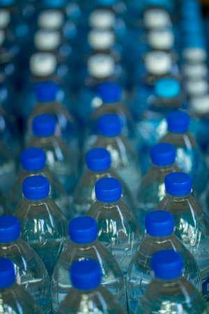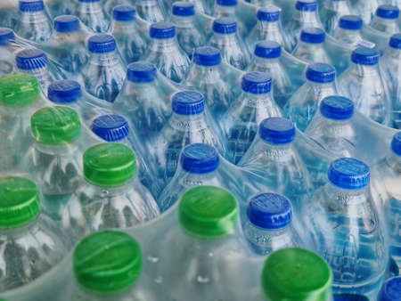 Many blue, yellow, green drinking water and refreshment beverage bottle caps and pure drinking water bottles in a drinking water production plant or supermarket shelf. Close up. Selective focus.