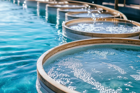 Bubbling water fills circular wooden tubs at serene wellness spa. Clear blue pool setting creates calming atmosphere. Concept of relaxation, spa treatments, health and wellness.