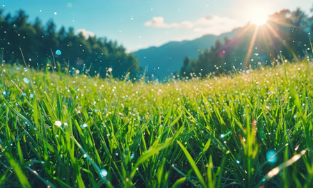 Grass with raindrops. Watering the lawn. Rain. Blurred Background of grass with water droplets in close-up. Landscape design. Nature. Garden, background for landscaping. Environmental concept, field, rain