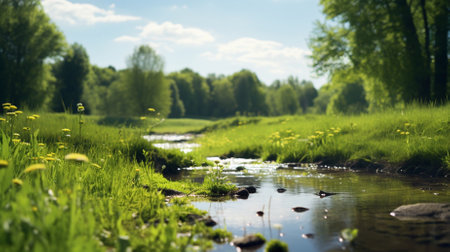 A stream flows through a vibrant green field, creating a picturesque scene of nature in motion, A babbling brook winding its way through a peaceful meadow