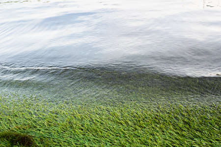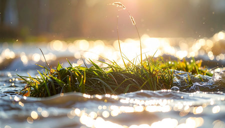 Water gently ripples as sunlight sets, illuminating vibrant green grass and creating a serene atmosphere.