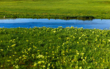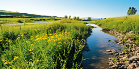 A tranquil river scene showcases clear water meandering through vibrant greenery. Yellow wildflowers bloom along the banks, adding a splash of color. The image's natural lighting enhances the textures of the water and vegetation. Ideal for environmental, nature, and landscape projects, the photograph is versatile for various commercial uses.