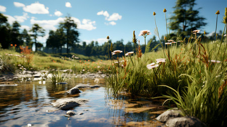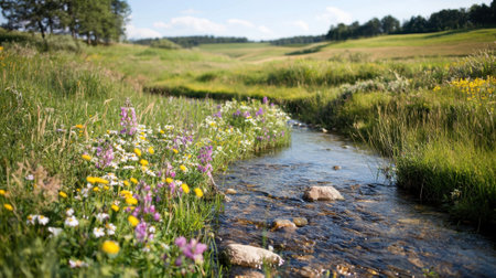 A tranquil stream winds through a lush green meadow adorned with colorful wildflowers. Bright sunlight reflects off the clear water, creating a serene atmosphere, perfect for nature lovers.