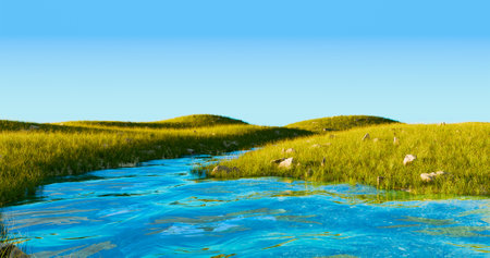 Serene landscape with blue stream flows through rolling green hills covered in lush grass with scattered rocks and bright cloudless sky. Concept of travel, environment. Calming nature. 3d render.