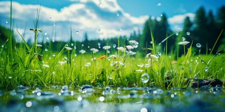 Magnificent and transparent raindrops on the background of a green meadow and a blue sky. Green tones in the image. Selective focus.