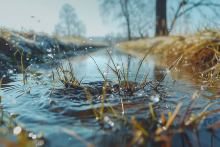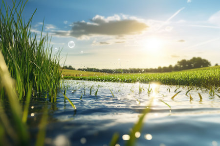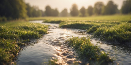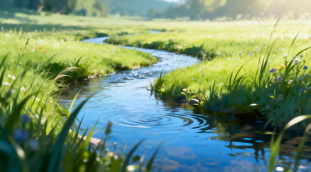 An artistic depiction of a tranquil meadow featuring a meandering stream with clear, reflective water. The scene is bathed in soft, golden sunlight, creating a peaceful atmosphere. Dominated by soothing shades of green and blue, this landscape evokes a sense of calm and relaxation. Ideal for use in wellness and nature-themed projects. AI-generated illustration.