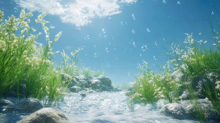 This stunning underwater scene captures the beauty of nature with vibrant wildflowers, bubbles rising to the surface, and sunlight filtering through the clear water, creating a tranquil and refreshing ambiance perfect for nature lovers.