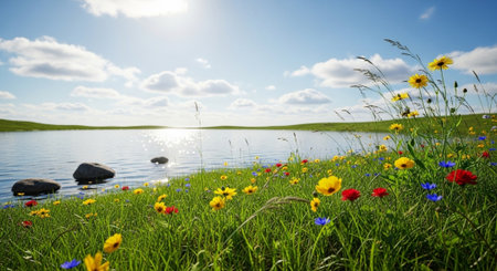 Scenic lakeside meadow with vibrant wildflowers under sunny sky