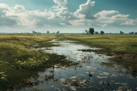 Escape to a serene wetland lagoon, where tranquil waters mirror a peaceful sky and lush greenery Undisturbed nature unfolds, inviting relaxation and contemplation The picturesque scene, reflecting clouds and trees, fosters mindful reflection and appreciation for the natural world Find tranquility here AI Generative