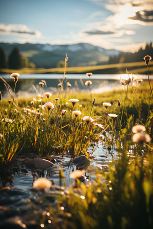 Crystal clear water flows through a field of daisies in a peaceful alpine valley, creating a tranquil and idyllic scene