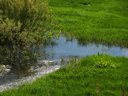 Small river with stones and grass on a sunny day. Shallow depth of field
