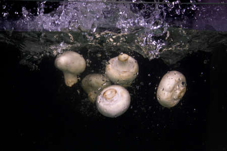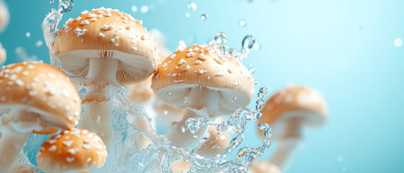 Fresh mushrooms splashing into clear water, dynamic motion, light blue background